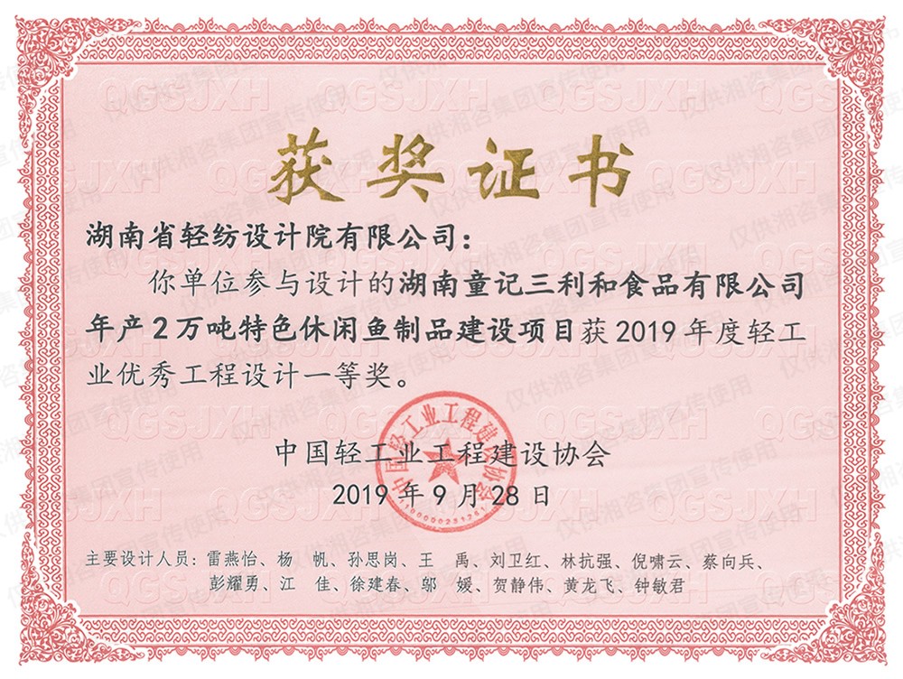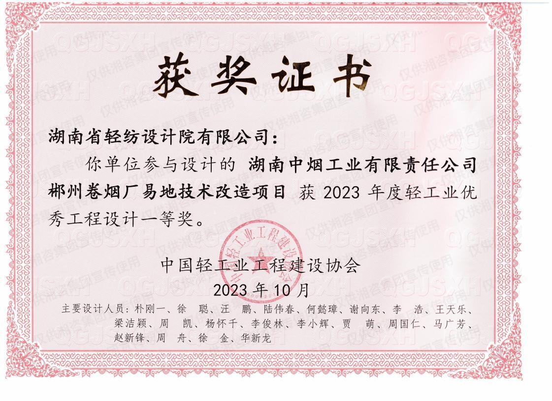 中國輕工業(yè)工程建設(shè)協(xié)會優(yōu)秀工程設(shè)計(jì)一等獎