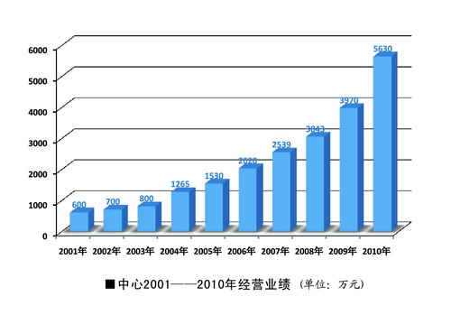 2010年,中心總收入達到5630萬元,是2000年26萬元的216倍。2004年,中心總收入過千萬,達到1265萬元;2006年突破2000萬元,達到2020萬元;2008年突破3000萬元,達到3043萬元。中心總收入十年保持高速增長。