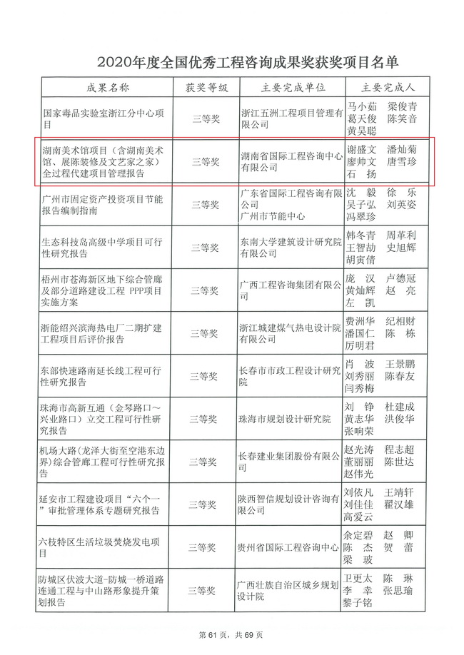 2021年3月5日,中國(guó)工程咨詢(xún)協(xié)會(huì)公布了“2020年度全國(guó)優(yōu)秀工程咨詢(xún)成果獎(jiǎng)獲獎(jiǎng)名單”的通知。省咨詢(xún)公司有3項(xiàng)工程咨詢(xún)成果榮獲國(guó)家優(yōu)秀工程咨詢(xún)成果獎(jiǎng),其中投融資與戰(zhàn)略咨詢(xún)部完成的《湖南現(xiàn)代農(nóng)業(yè)集團(tuán)發(fā)展戰(zhàn)略規(guī)劃(2020—2024)》榮獲國(guó)家優(yōu)秀工程咨詢(xún)成果獎(jiǎng)二等獎(jiǎng),生態(tài)規(guī)劃咨詢(xún)部完成的《湖南省洞庭湖水環(huán)境綜合治理專(zhuān)題研究報(bào)告》、建設(shè)工程管理咨詢(xún)部完成的《湖南美術(shù)館項(xiàng)目(含湖南美術(shù)館、展陳裝修及文藝家之家)全過(guò)程代建項(xiàng)目管理報(bào)告》榮獲國(guó)家優(yōu)秀工程咨詢(xún)成果獎(jiǎng)三等獎(jiǎng)。