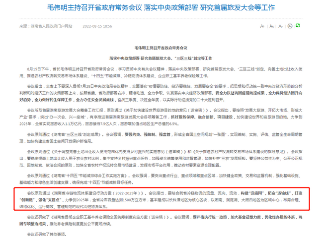 2022年8月15日下午,省長毛偉明主持召開省政府常務會議,研究審議通過了省咨詢公司編制的《湖南省冷鏈物流體系建設行動方案(2022-2025年)》課題,會議指出要結合我省冷鏈物流的流量、流向、流效,構建“設施網(wǎng)”,拓寬“運輸線”,打造“創(chuàng)新鏈”,強化“支撐點”,力爭到2025年,全省冷庫容量達到1500萬立方米,基本建成以長株潭地區(qū)為核心區(qū)塊,以湘南、洞庭湖、大湘西地區(qū)為區(qū)域中心,布局合理、結構優(yōu)化、運行高效、管理規(guī)范的現(xiàn)代冷鏈物流體系。