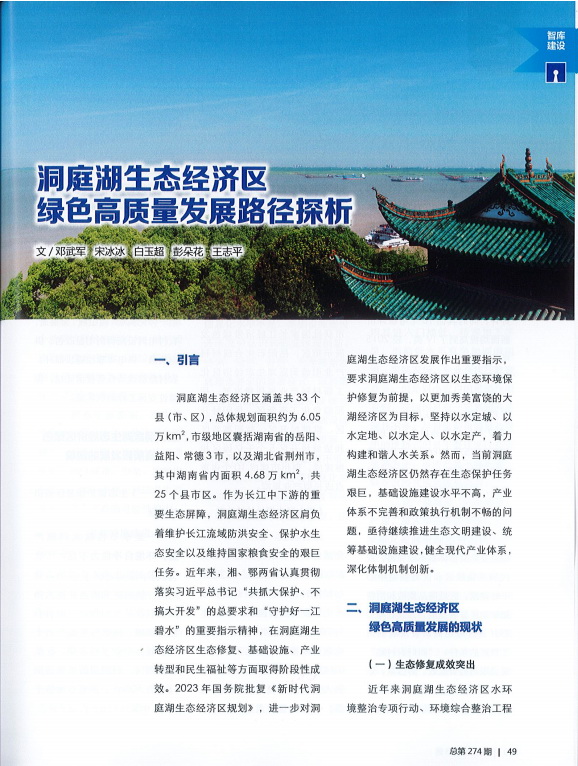 近年來,湘、鄂兩省在洞庭湖生態(tài)經(jīng)濟(jì)區(qū)生態(tài)修復(fù)、基礎(chǔ)設(shè)施、產(chǎn)業(yè)轉(zhuǎn)型和民生福祉等方面取得階段性成效。2023年2月國務(wù)院批復(fù)《新時(shí)代洞庭湖生態(tài)經(jīng)濟(jì)區(qū)規(guī)劃》,進(jìn)一步對洞庭湖生態(tài)經(jīng)濟(jì)區(qū)發(fā)展作出重要指示。然而,當(dāng)前洞庭湖生態(tài)經(jīng)濟(jì)區(qū)仍然存在生態(tài)保護(hù)任務(wù)艱巨,基礎(chǔ)設(shè)施建設(shè)水平不高,產(chǎn)業(yè)體系不完善和政策執(zhí)行機(jī)制不暢的問題。本文在精準(zhǔn)分析洞庭湖生態(tài)經(jīng)濟(jì)區(qū)發(fā)展困境的基礎(chǔ)上,從生態(tài)文明、基礎(chǔ)設(shè)施、產(chǎn)業(yè)發(fā)展、政策保障等方面探析洞庭湖生態(tài)經(jīng)濟(jì)區(qū)綠色高質(zhì)量發(fā)展路徑。