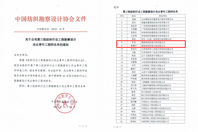 近日,中國紡織勘察設計協(xié)會正式公布了“第三批紡織行業(yè)工程勘察設計杰出青年工程師”評選結果,湘咨集團下屬省輕紡院申龍、蔡德昌2名專家榮獲“第三批紡織行業(yè)勘察設計杰出青年工程師”榮譽稱號。