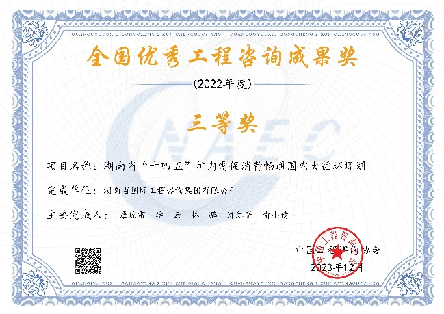 近日,中國(guó)工程咨詢協(xié)會(huì)公布了2022年度全國(guó)優(yōu)秀工程咨詢成果獎(jiǎng)獲獎(jiǎng)項(xiàng)目名單,由湘咨集團(tuán)編制的三項(xiàng)成果榮獲全國(guó)優(yōu)秀工程咨詢成果獎(jiǎng)三等獎(jiǎng)。據(jù)悉,湖南省此次共有7家咨詢機(jī)構(gòu)計(jì)12項(xiàng)成果獲獎(jiǎng),湘咨集團(tuán)獲獎(jiǎng)數(shù)量占總獲獎(jiǎng)數(shù)的四分之一。