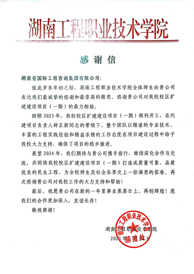 近日,湘咨集團(tuán)收到來(lái)自湖南省發(fā)展改革委、湖南工程職業(yè)技術(shù)學(xué)院發(fā)來(lái)的感謝信。信中對(duì)集團(tuán)代建項(xiàng)目經(jīng)理鐘正新同志及代建管理團(tuán)隊(duì)在該校校區(qū)擴(kuò)建建設(shè)項(xiàng)目(一期)代建管理方面的專(zhuān)業(yè)、務(wù)實(shí)、高效給予高度贊譽(yù),對(duì)投融資與戰(zhàn)略咨詢(xún)事業(yè)部蔡丹丹同志積極協(xié)助配合美麗中國(guó)評(píng)估組在湘聯(lián)絡(luò)協(xié)調(diào)、開(kāi)展環(huán)境基礎(chǔ)設(shè)施摸底調(diào)查等工作給予充分肯定。
