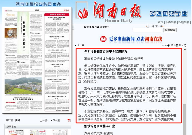 為順利實現(xiàn)“三高四新”美好藍圖,加快推進高質(zhì)量發(fā)展,湖南省委決定在全省開展解放思想大討論活動,發(fā)起“獻策湖南”金點子征集活動。湘咨集團作為省級“智囊團”積極響應(yīng),撰寫的《全力提升湖南能源安全保障能力》于3月18日被湖南日報摘登發(fā)表。
