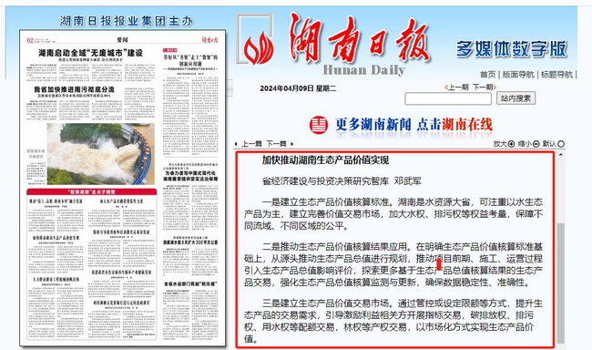 為順利實(shí)現(xiàn)“三高四新”美好藍(lán)圖,加快推進(jìn)高質(zhì)量發(fā)展,湖南省委決定在全省開展解放思想大討論活動,面向社會開展“獻(xiàn)策湖南”金點(diǎn)子征集活動。湖南省國際工程咨詢集團(tuán)有限公司(以下簡稱“湘咨集團(tuán)”)作為省級“智囊團(tuán)”積極響應(yīng),撰寫的《加快推動湖南生態(tài)產(chǎn)品價值實(shí)現(xiàn)》于4月9日獲湖南日報再次摘登。
