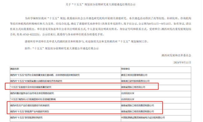 近日,根據(jù)衡陽市和湘西州發(fā)展改革委“十五五”規(guī)劃前期研究重大課題遴選結(jié)果公示,湘咨集團(tuán)成功中標(biāo)《衡陽市優(yōu)化投資結(jié)構(gòu)和提升投資效益研究》《衡陽縣域經(jīng)濟(jì)高質(zhì)量發(fā)展研究》《湘西州生態(tài)產(chǎn)品價值實現(xiàn)路徑與機(jī)制研究》《湘西州“十五五"新能源產(chǎn)業(yè)專題研究報告》《“十五五”全面提升全州項目儲備質(zhì)量的研究》等多個課題。