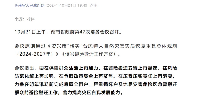 10月21日上午,湖南省政府第47次常務(wù)會議召開,會議原則通過了由湘咨集團編制的《資興市“格美”臺風(fēng)特大自然災(zāi)害災(zāi)后恢復(fù)重建總體規(guī)劃(2024-2027······